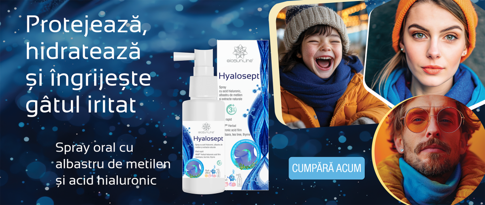 Spray oral cu albastru de metilen si acid hialuronic. Albastrul de metilen are efect antiseptic, iar acidul hialuronic contribuie la regenerarea mucoasei faringiene.